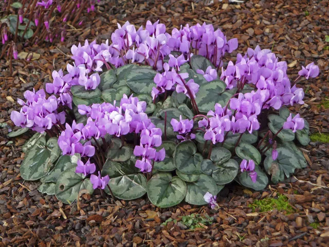 También conocido como «ciclamen de hoja de hiedra», esta especie de ciclamen destaca por su resistencia en exteriores, lo que la convierte en una opción estupenda para decorar jardines. Sus flores son más discretas y las tonalidades abarcan el blanco, rosa y fúcsia. Otra característica destacable son sus hojas, en forma de corazón.