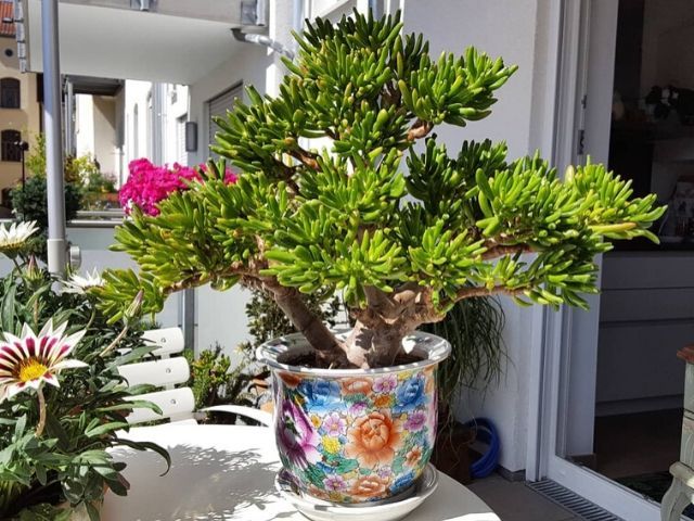 El árbol de jade (Crassula ovata), es una planta suculenta que se desarrolla en forma de pequeño árbol, aunque en condiciones favorables puede llegar a superar el metro y medio de altura. Sus hojas son de color verde intenso y destaca por ser resistente al viento, al sol y a la salinidad en el aire. Es idónea para hogares cerca del mar.